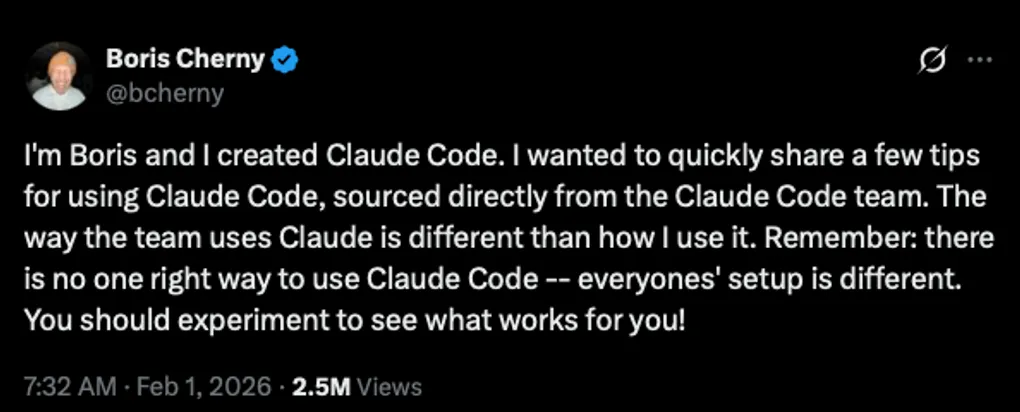 本文整理自 Claude Code 創建者 Boris Cherny 在 X(前 Twitter)上的分享,內容來自 Claude Code 團隊的實際使用經驗。每個人的環境和配置都不同,沒有唯一正確的用法——多實驗,找到最適合自己的方式。